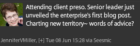 I just returned from a quarterly management meeting being hosted by a client. It’s a two-day meeting being held offsite for 30 mid- to senior-level managers of a business unit. During the meeting, Pete, head of a 1200-person business unit, unveiled his brand-new blog. I really admire Pete. He’s been taking risks and encouraging his staff to do the same. When he revealed the blog today, his group gave him some good natured ribbing– “So, can employees ‘write on your wall?’ ” and “Yeah, SURE they can post anonymously.” And: “What? Are you going to go on Twitter now too?!” Pete openly admits that this experiment may not work. In general, efforts to use social media have not taken hold in his company. However, Pete remains undeterred. He wants to fully explore the opportunities that a social media platform can bring to his workforce.