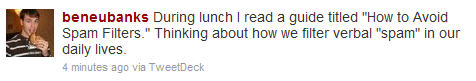 How often are you subjected to verbal “spam” in the workplace? Probably more often than you’d like. My first reaction to Ben’s tweet was to imagine people who blather on, saying nothing of value. But then, I had a thought of how maybe there is some measure of value to some people’s “spam”. Ever heard the saying “one person’s trash is another person’s treasure?” I think this saying could apply to the communication process as well. Maybe some people are just droning on and on, but what if they are simply at cross-purposes with their listener? What equates to trashy spam for you as the listener may indeed be another person’s golden treasure.