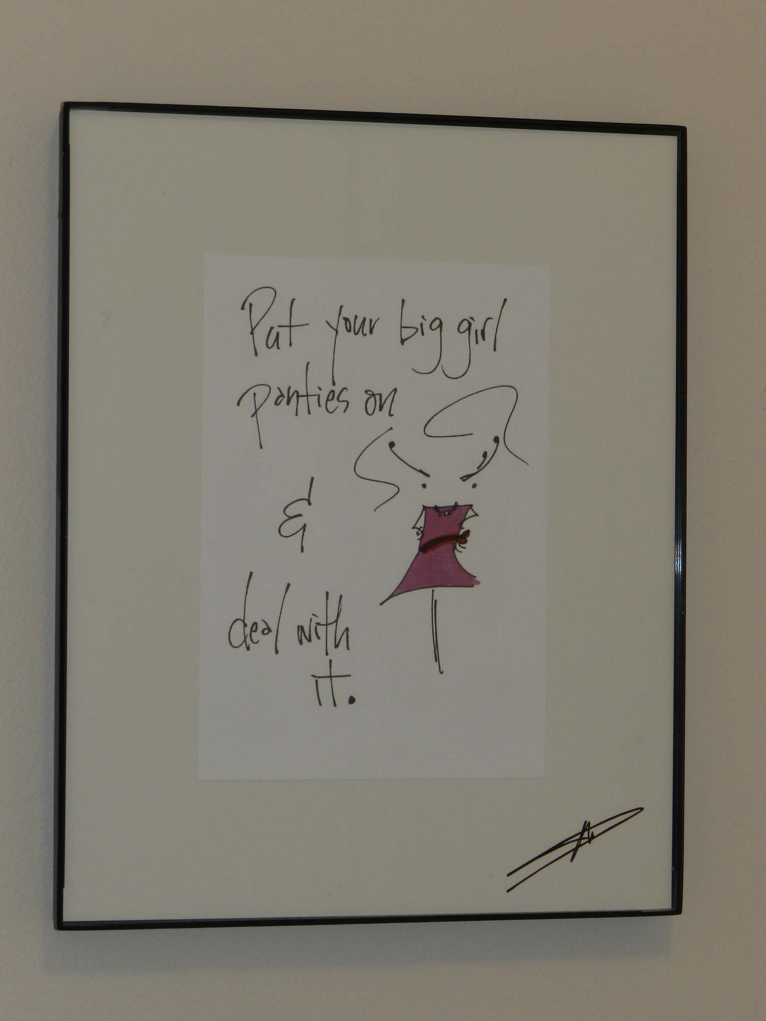 I was hard at work at my desk one day, concentrating on a project. I sensed someone standing in my doorway, then heard chuckling. I looked up to find my staid, quiet “cube wall” neighbor laughing and pointing. She was directing her attention to framed artwork on my office wall that reads “Put your big girl panties on and deal with it.”