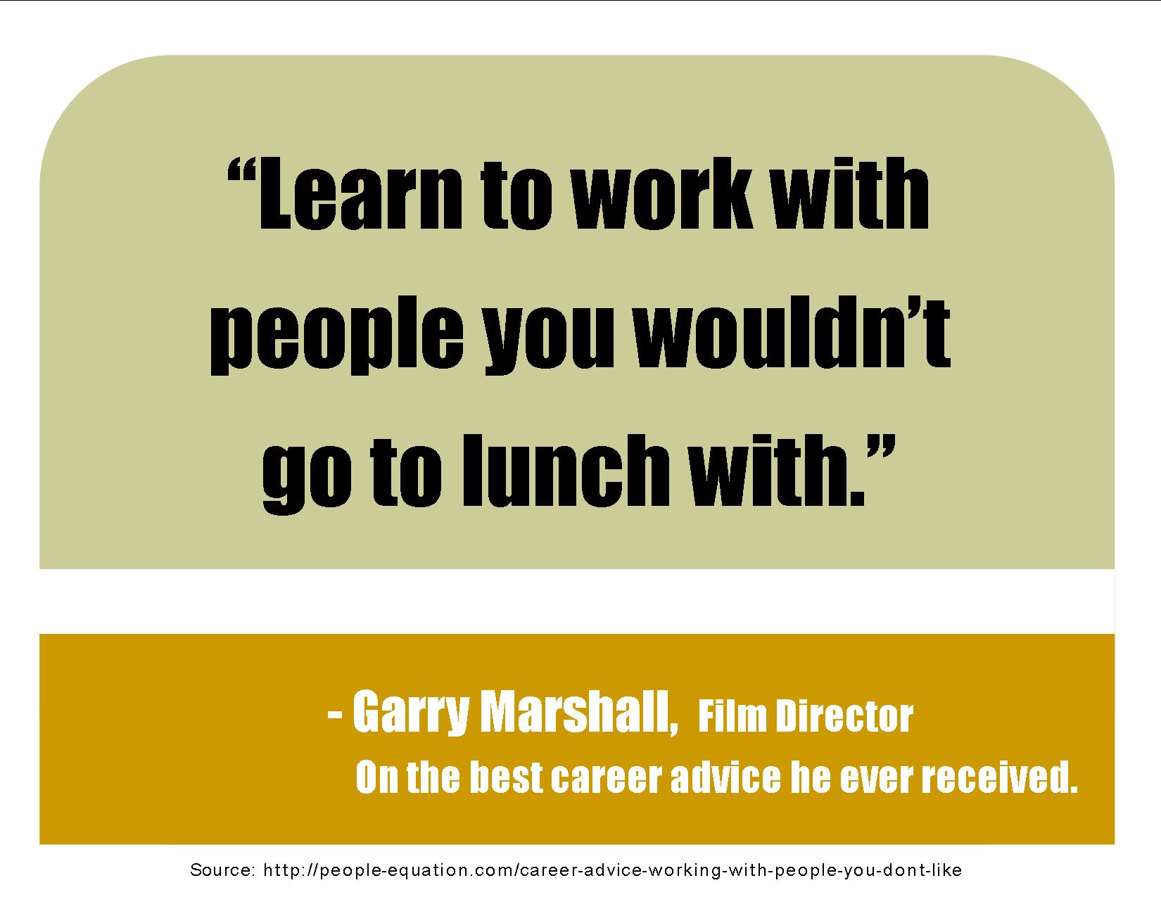 Career Advice – Working with People You Don’t Likeby Jennifer V. MillerGarry Marshall said that his dad told him this. I think it’s sound advice. You’re not going to love everyone you work with. But you do need to figure out a way to “make it work”.