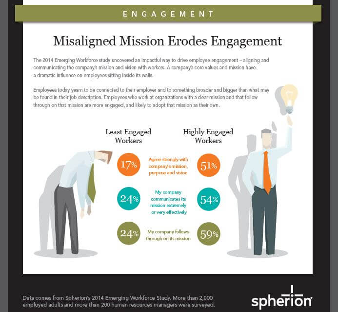 As you might expect, there’s a connection between employee engagement and a company’s mission. (See the “Engagement” section that’s excerpted from the full infographic.) Employees who self-identified as “highly engaged” in their work agreed that their company follows through on its mission. There was also a connection between how well the company communicates its mission and how “engaged” employees reported feeling.