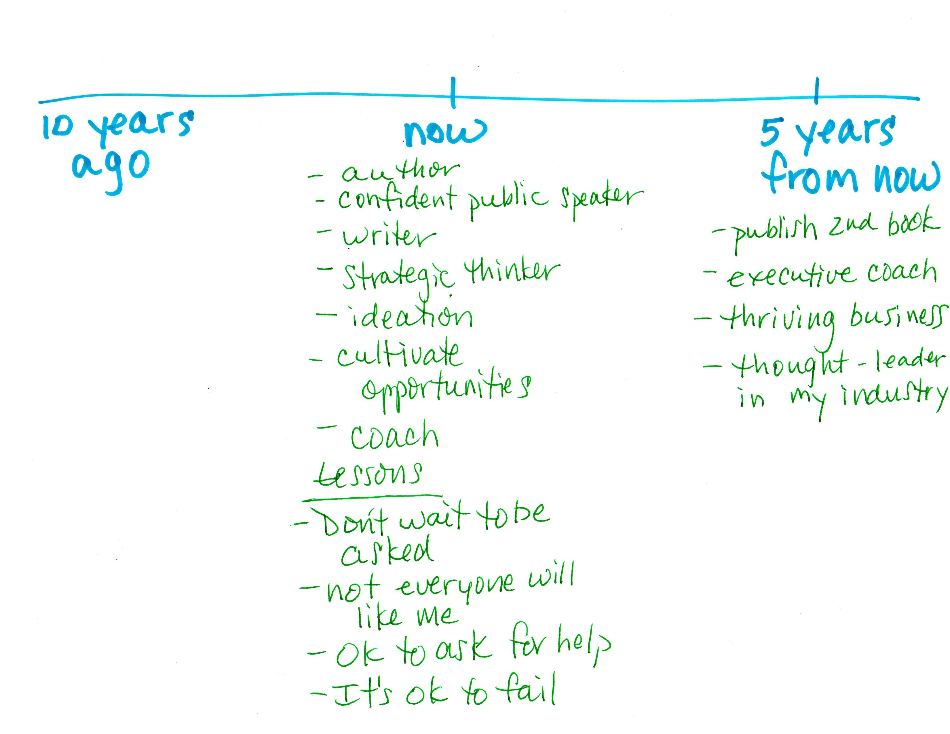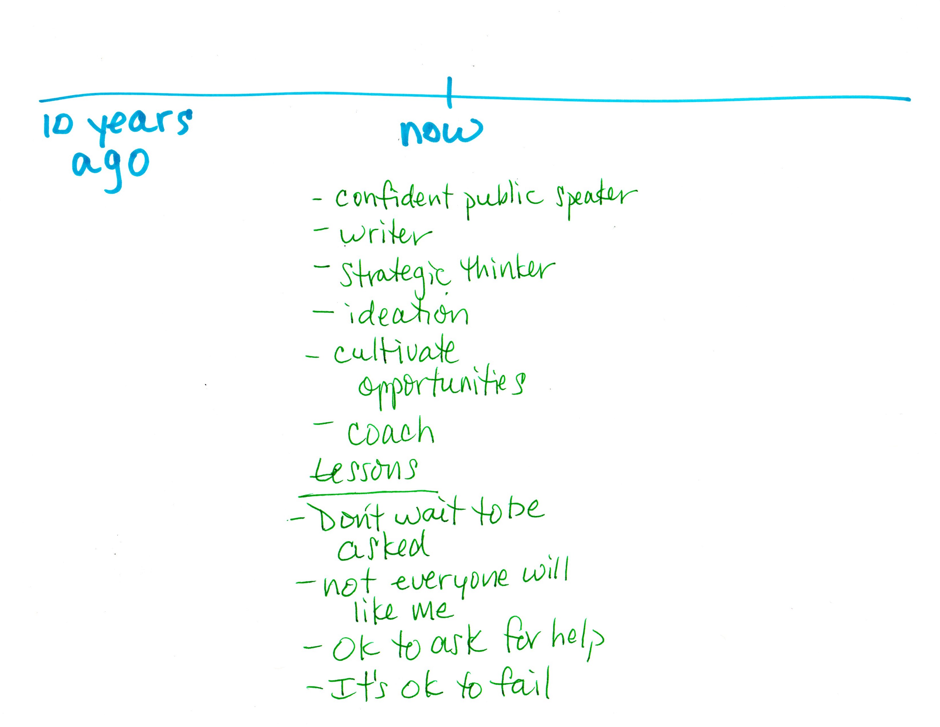 5. Next, write underneath the space marked “Now” a list of things that you know now that you didn’t know X years ago. Think of this list as both a “lessons learned” and “skills I have mastered”.