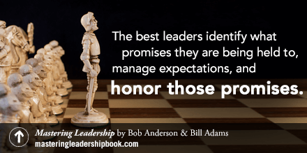 promises mastering leadership quotePeople expect things of you when you become a leader.  “When we step into leadership, we may not be aware that it comes with implicit promises in the form of expectations,” says Bob Anderson, co-author of the recently published Mastering Leadership.
